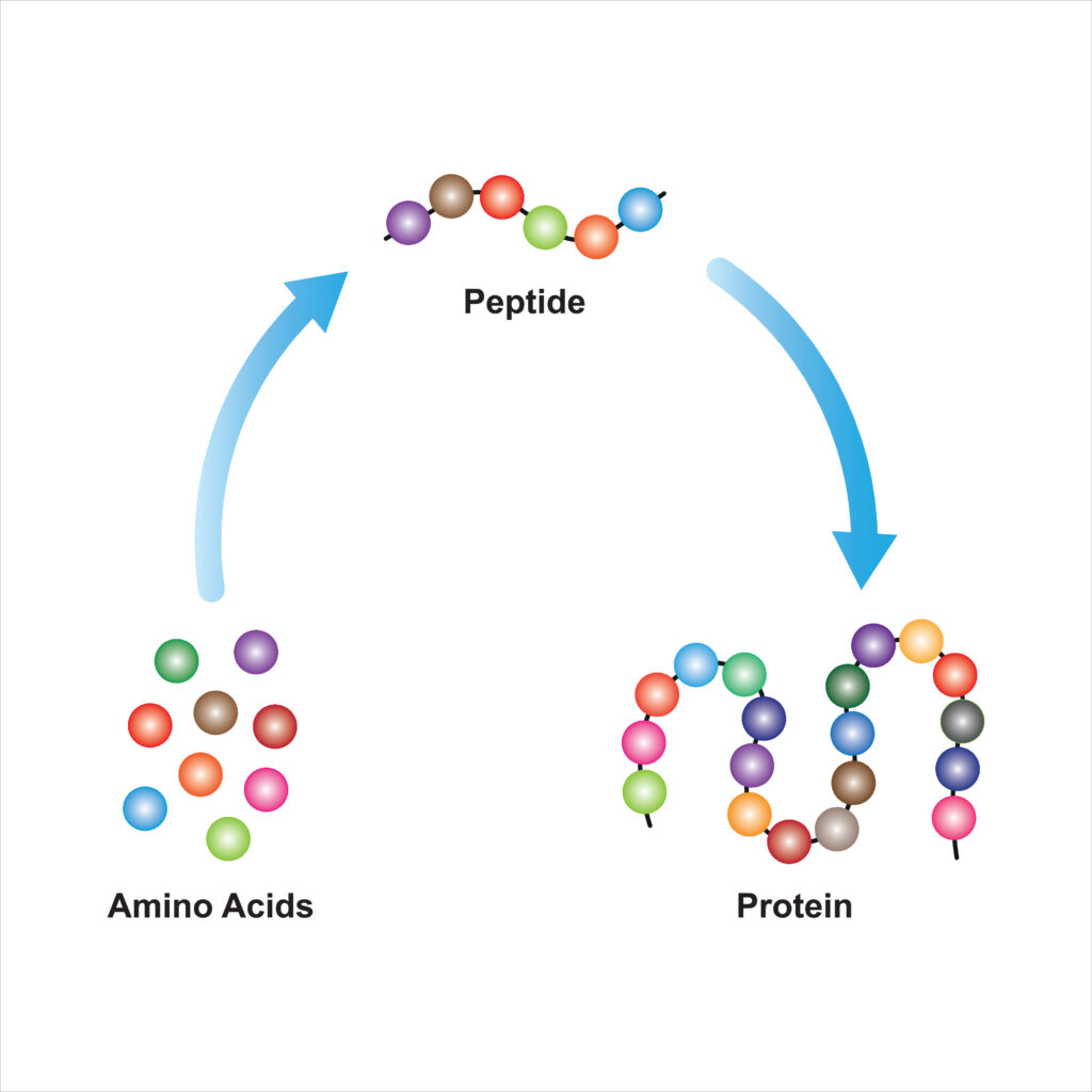 Und damit wären wir endlich bei unseren Proteinen angelangt. Proteine bestehen aus Aminosäuren. Aminosäuren sind die kleinste Einheit und es gibt sie in unterschiedlichen Varianten. Diese Aminosäuren legen sich zu Peptiden und dann zu langkettigen Aminosäure-Ketten zusammen, die schließlich die verschiedenen Proteine bilden.